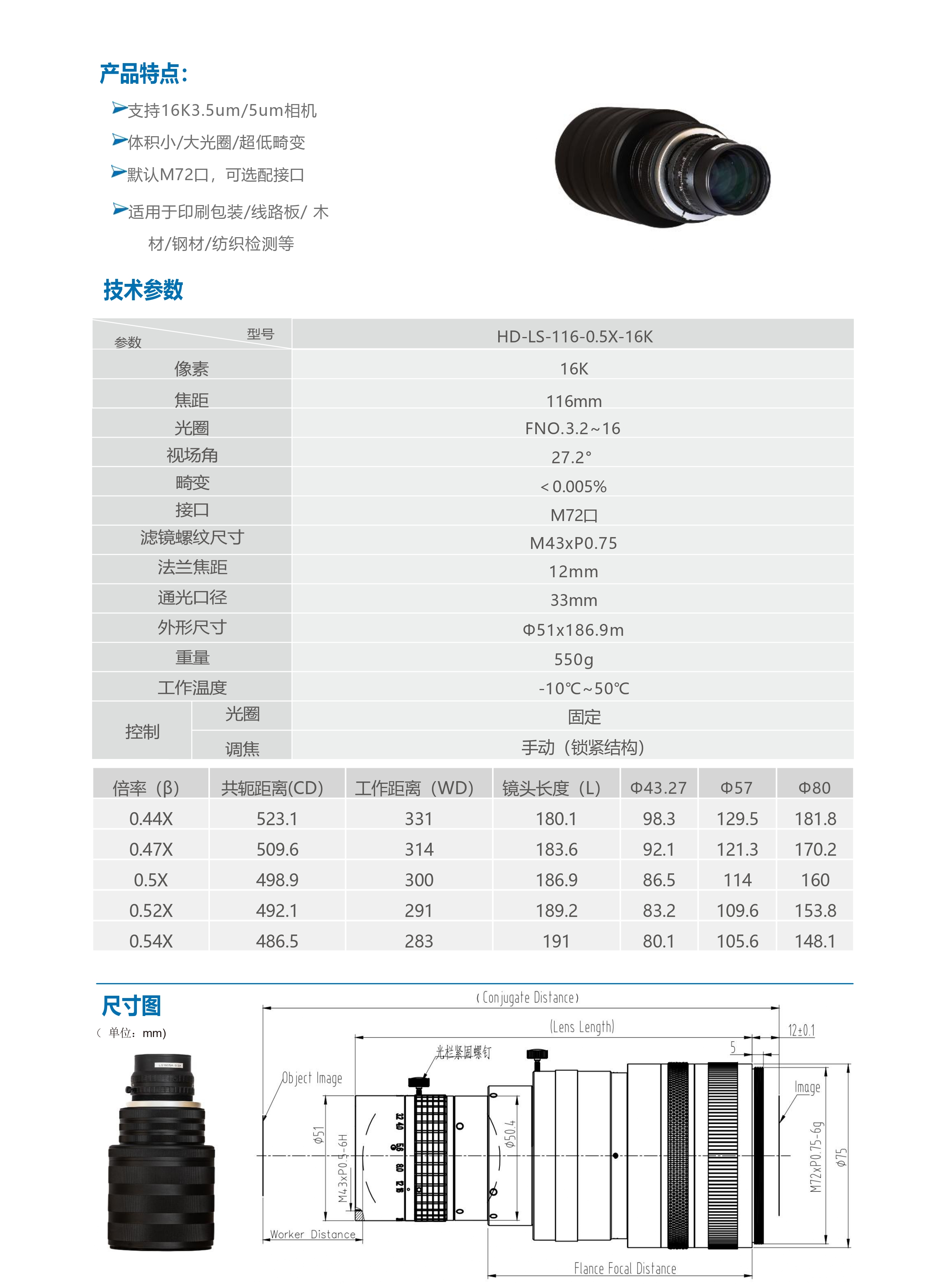 支持16K3.5um/5um相机 体积小/大光圈/超低畸变 默认M72口,可选配接口 适用于印刷包装/线路板/ 木材/钢材/纺织检测等